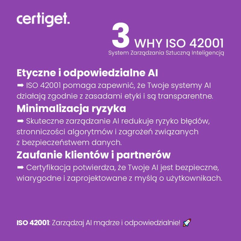 • Jakie korzyści daje certyfikacja ISO 42001? Certyfikacja potwierdza zaangażowanie organizacji w bezpieczne i etyczne zarządzanie AI, buduje zaufanie i minimalizuje ryzyko.